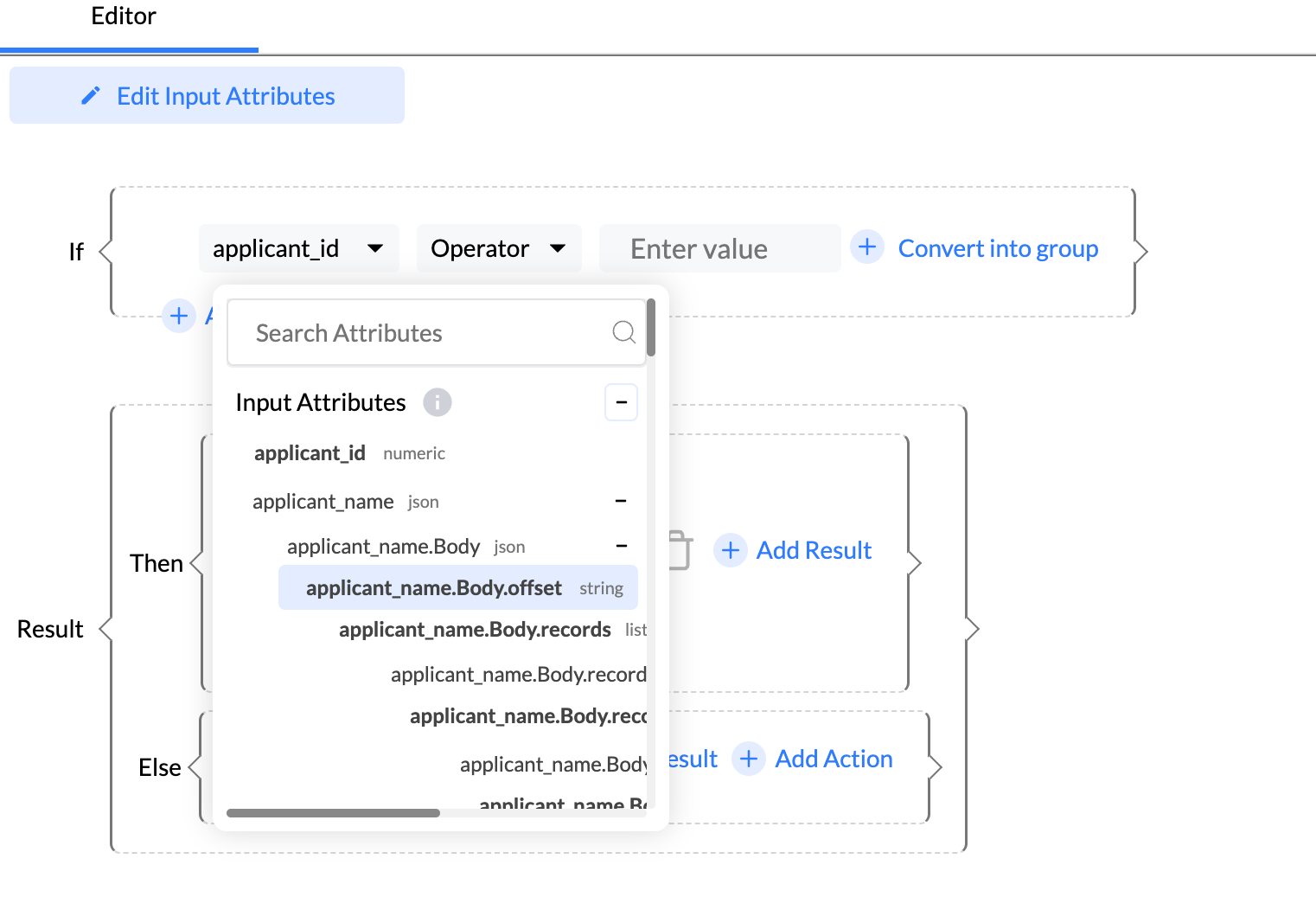 Now, after creating the input attribute from API, you can access the property in your rule editor. Here is how you can access the properties: