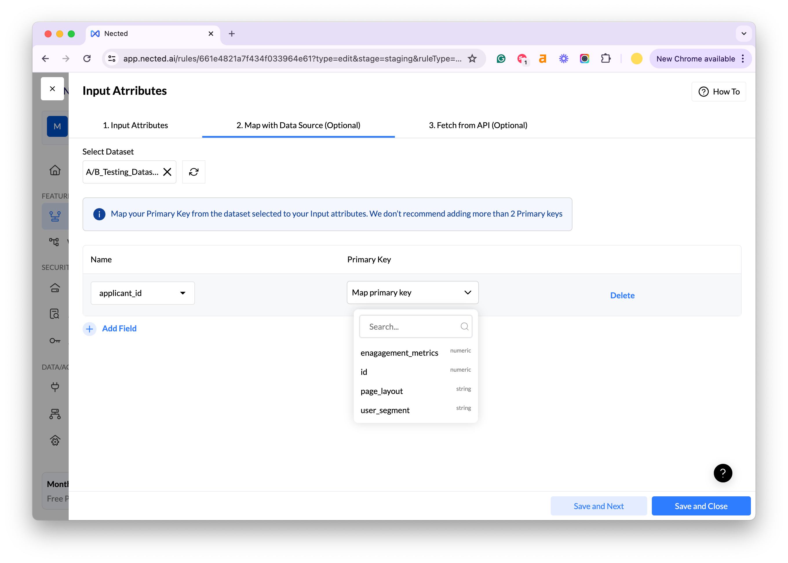 Nected further offers an efficient approach to attribute definition, eliminating manual data source mapping. You can specify a primary identifier, which Rule uses to automatically retrieve the required data from the database via the dataset. Here's how to define custom input attributes with dataset attributes: