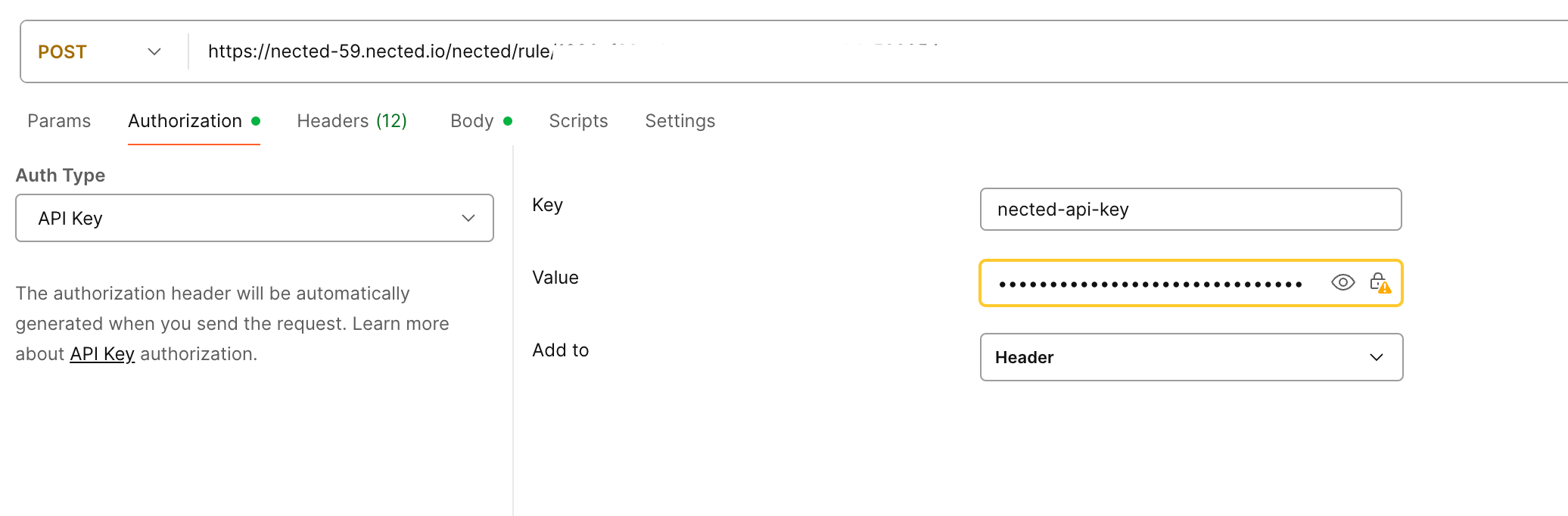 Now, go to the Authorization page. And simply copy the nected-api-key, like this: